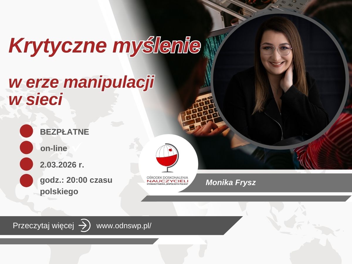 2 marca 2026 roku, o godzinie 20:00, odbędzie się bezpłatne szkolenie online dla Polaków we Włoszech pt. „Krytyczne myślenie w erze manipulacji w sieci". W dobie cyfrowej codziennie stajemy wobec ogro