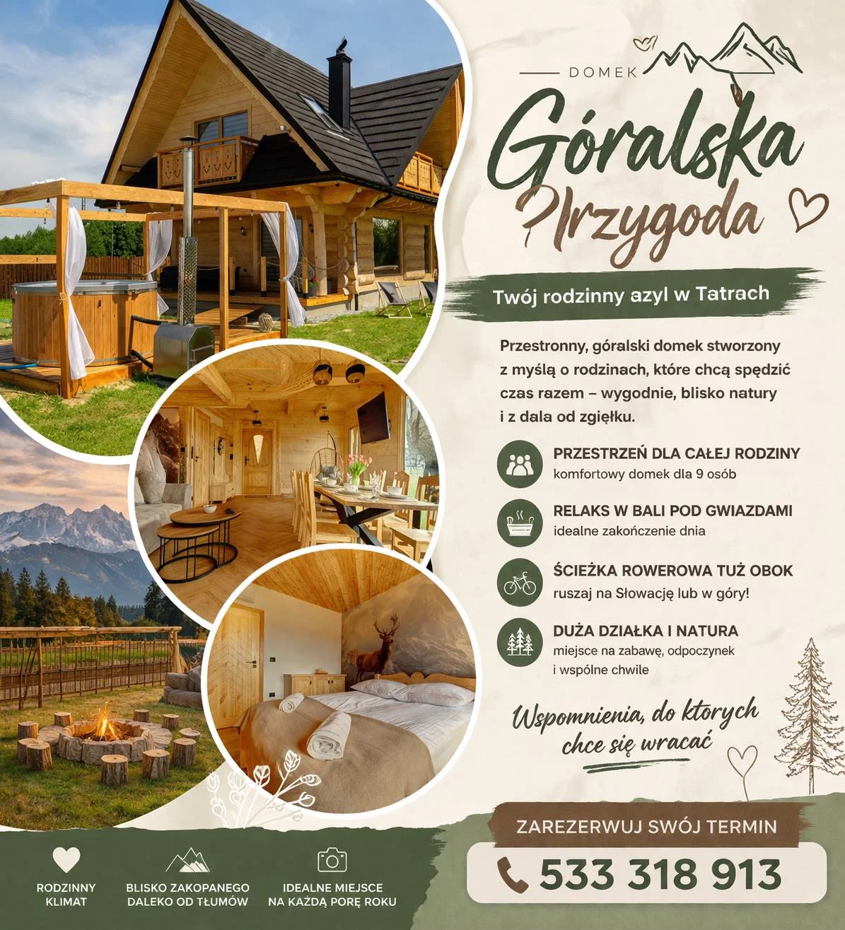 📍 Ścieżka rowerowa na Słowację, blisko Zakopanego Komfortowy domek dla maks. 9 osób – 3 sypialnie, 2 łazienki. Prywatna balia – idealna na wieczorny relaks. Duża, ogrodzona działka – przestrzeń na grill, ognisko i odpoczynek. Bezpośredni dostęp do ścieżki rowerowej na Słowację. Świetna lokalizacja – blisko Zakopanego i górskich atrakcji. W pełni wyposażona kuchnia + klimatyzacja.