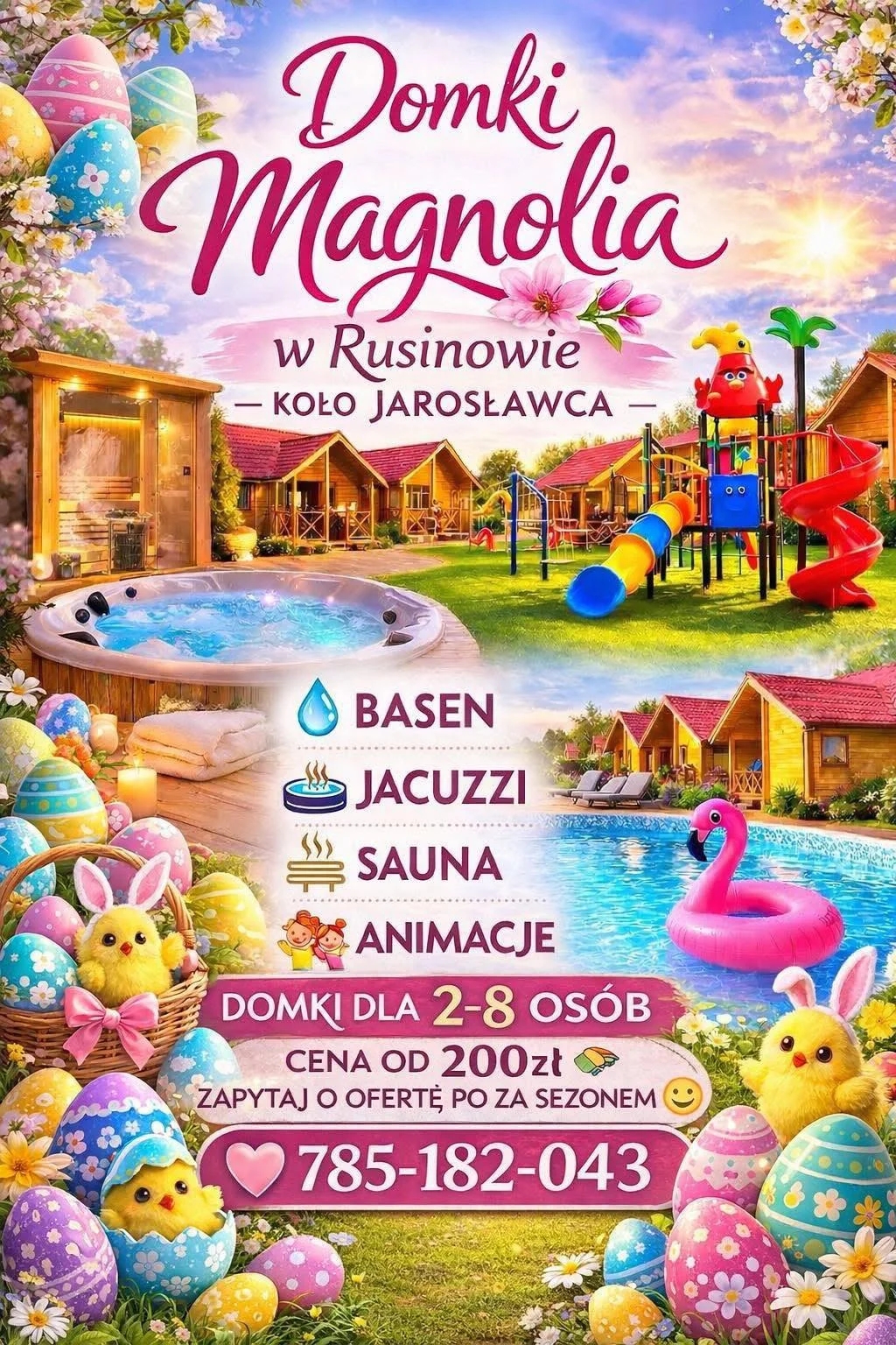 📍 800 m od plaży, Bazyliszka 6, koło Jarosławca Kameralna oaza spokoju dla rodzin z dziećmi. Basen, plac zabaw, trampolina, karaoke, seanse filmowe. Drewniane domki z tarasami i grillami. Jacuzzi, sauna. Rowery, gokarty. Sklep i restauracja blisko. Media w cenie.