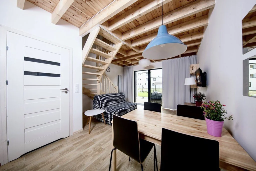 📍 150 m do morza, 100 m do jeziora Całoroczne domki piętrowe z dwiema sypialniami. Salon z aneksem kuchennym i łazienką. Ogrodzony taras z meblami ogrodowymi. Basen suchy dla dzieci, sauna, grill. Bezpłatny internet i parking. Zwierzęta bez opłaty. Brak dopłat za wodę, prąd i sprzątanie.
